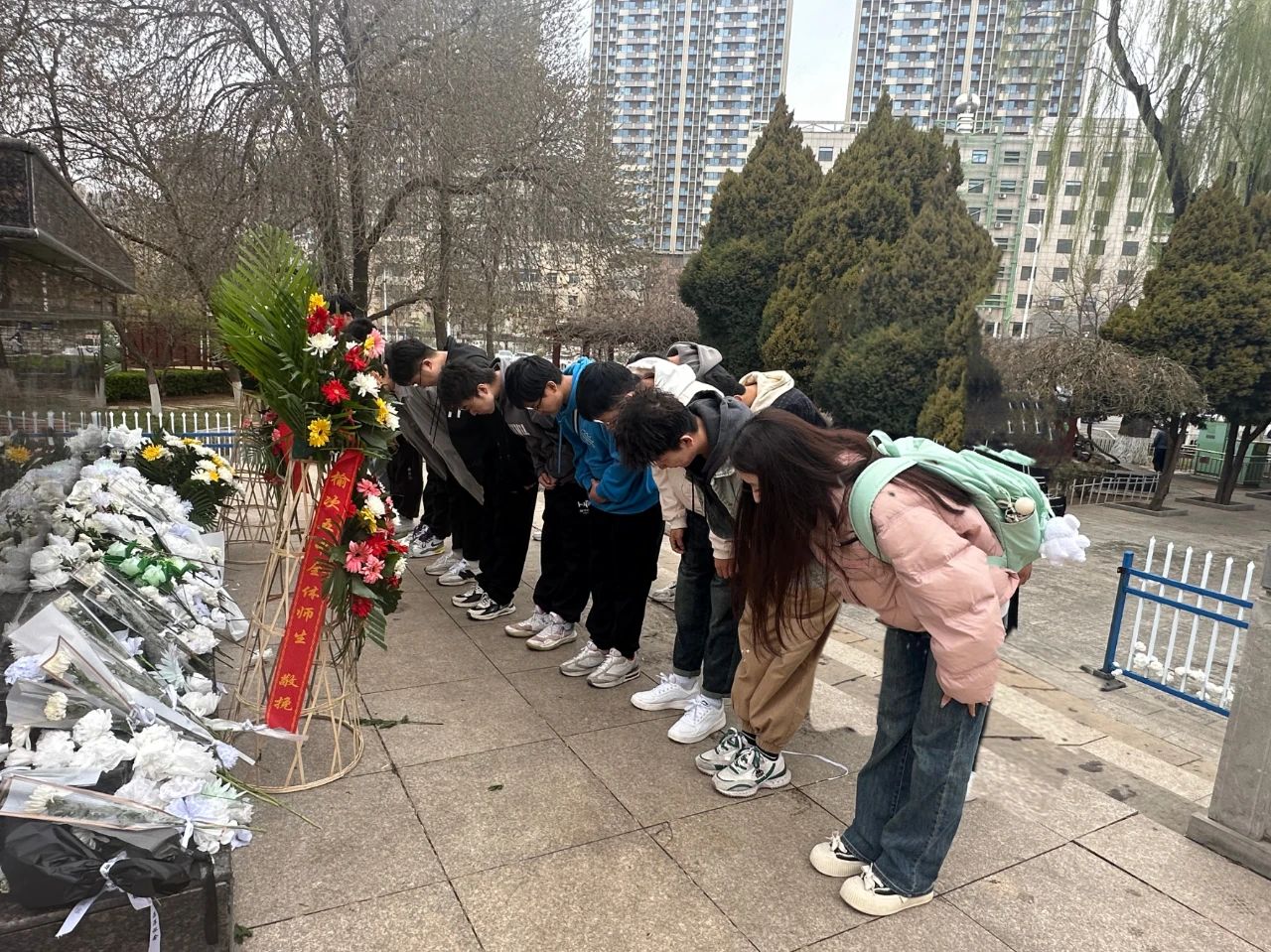 天地英雄气,千秋尚凛然。在庄严的革命烈士纪念碑前,全体同学肃立默哀,寄托深深的哀思。
