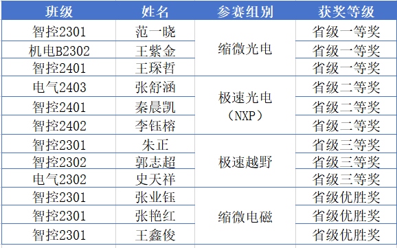 在第二十届全国大学生智能汽车竞赛(华北赛区)中,由电气系组织的参赛选手取得了省级一等奖1项、二等奖1项、三等奖1项、优胜奖1项的优秀成绩。