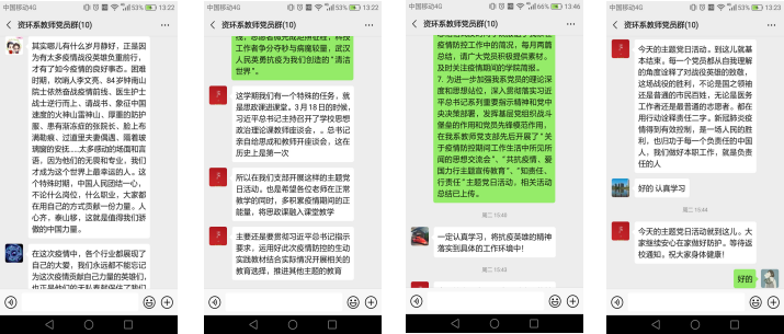 新型冠状病毒感染疫情发生以来,全国人民坚决贯彻落实习近平总书记重要指示精神和党中央决策部署,医护人员、警务人员、全国各工种人员全力以赴投入到战“疫”情、防风险、保安全、护稳定各项工作中,广大人民不畏艰险、不怕牺牲,坚守岗位、英勇奋战,涌现出许多可歌可泣的英雄事迹,更有许多医务人员、干部职工、社区工作者为抗击疫情和维护安全稳定作出了重大牺牲和奉献。国旗半垂,举国同哀,缅怀英烈,致敬英雄。针对抗“疫”战争中涌现的先进人物和感人事迹,资源与环境工程系党支部于2020年4月7日下午在教师党支部和学生党支部微信群组织开展了“致敬战“疫”英雄”主题线上党日活动,激励师生牢记入党初心与使命,忠诚履职尽责,踏着他们的足迹奋力前行,用青春践行使命,用行动实现梦想。为使主题党日活动开的成功,开出成效,总支书记马蔚东、组织员李晓建提前准备,定好主题、列出提纲,并做引领发言。