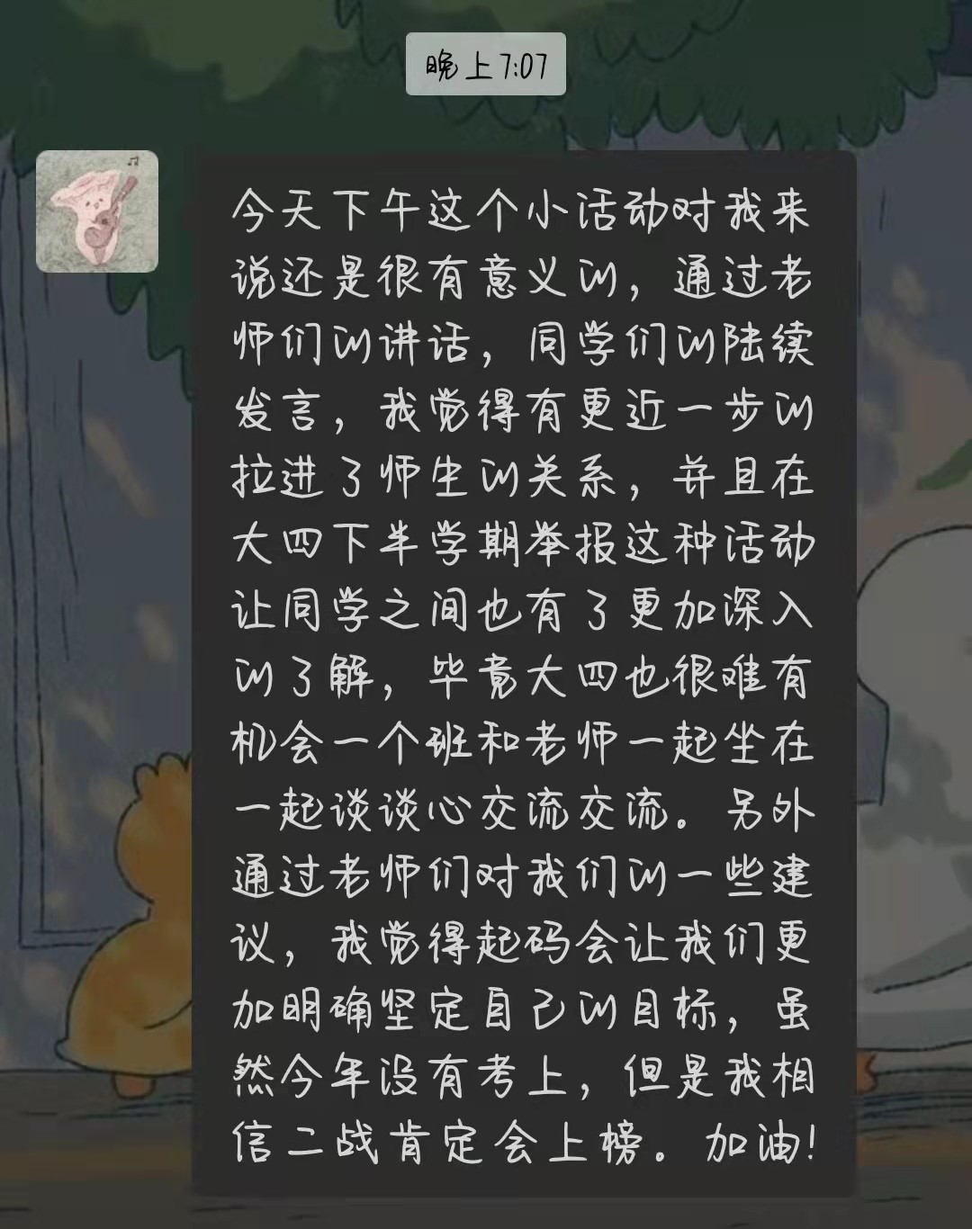 “大家每天按时起床了吗?”“按点吃饭吗?”“进入学习状态了吗?”马书记以这样简单而又亲切的三句话,拉开了本次师生交流活动的序幕……她用朴实的语言,传递出对学生的殷殷期待,她希望大家珍惜大学时光,认真准备毕业论文,这个阶段需要自律,安排好时间,独立自主来完成一些东西,对四年的学习生活一个总结。