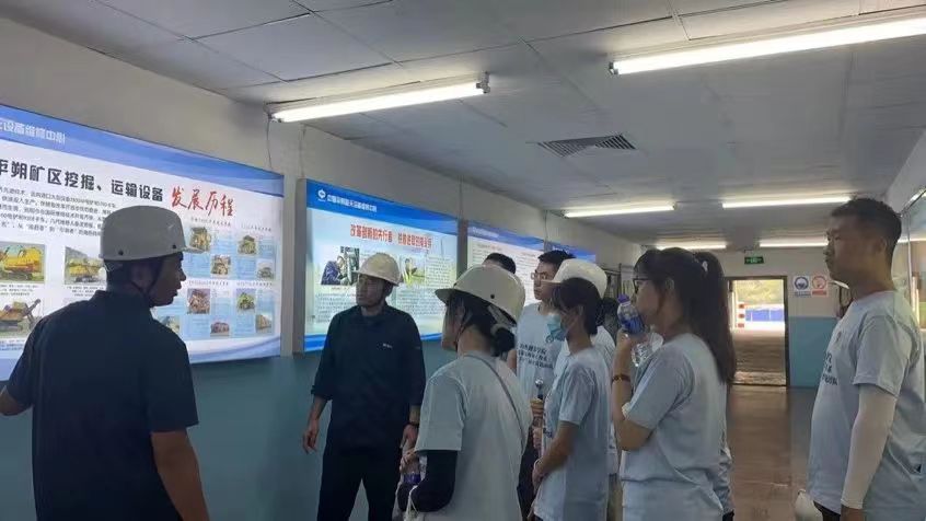 实践队一行人在车间经理的带领下,对车间进行参观学习,并围绕企业基本情况、车间仪器设备、露天煤矿开采煤层的流程等方面做了详细介绍,并与学生交流探讨煤层开采现状与目前面临的大型挖煤机油污染等环保方面问题,随后还邀请实践队成员登入730大卡车驾驶舱体验。