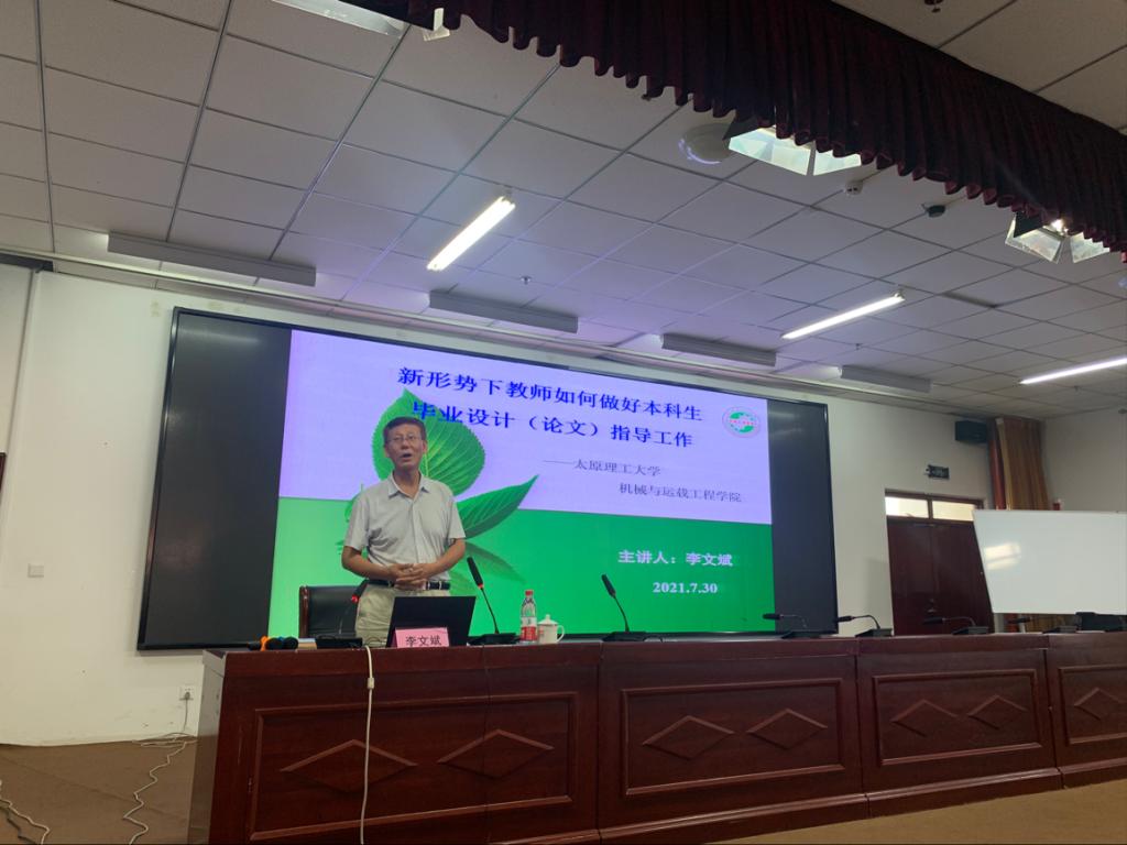太原理工大学李文斌教授做了题为《新形势下教师如何做好本科生毕业设计(论文)的指导工作》的培训。结合太原理工大学的做法和自己的经验,分别从新形势下毕设的思考、培养目标,工作流程、要求、指导这五个方面具体阐述了毕设的指导建议。