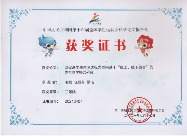 2021年8月27日,山西省教育厅发布了《省教育厅关于第十四届全国学生运动会科学论文报告会山西省论文评审结果的通报》,永利官网强基学院教师毛磊、任丽芳提交的《以促进学生体测达标为导向基于“线上、线下”融合的体育教学模式研究》一文获得全国三等奖、山西省二等奖。据悉,本届科报会,山西省共征集论文415篇,经专家组评审后遴选出160篇论文报送全国进行参评,最终共有43篇论文获国家级奖项。其中2篇获全国一等奖,14篇获全国二等奖,27篇获全国三等奖。