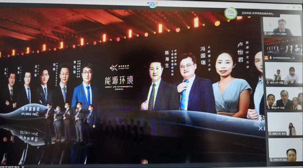 11月26日,2021年和2022年“科学探索奖”颁奖典礼在深圳市举行,两届获奖的共100位青年科学家通过腾讯会议线上线下同步出席了颁奖仪式。冯国瑞副院长(主持行政工作)作为第三届“科学探索奖”(2021年)的获得者,由于疫情防控原因放弃了线下参加典礼仪式的机会,线上参加了颁奖典礼。“科学探索奖”肯定了冯国瑞教授在遗煤开采岩层控制与残采区瓦斯资源化抽采等方面的贡献,支持他在遗煤开采多元灾害防控方向进行探索。