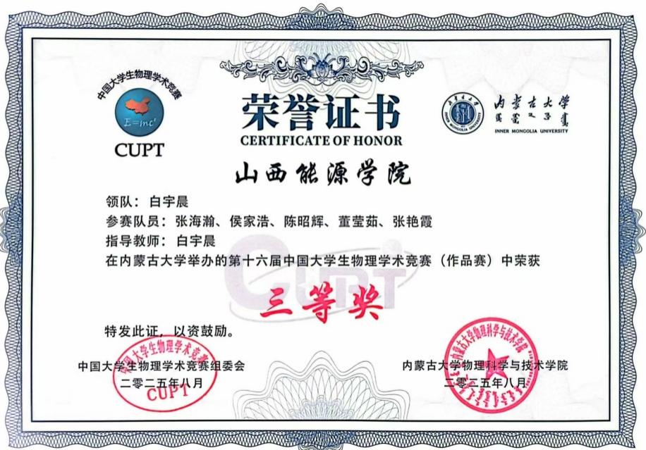 8月14日至18日,第十六届中国大学生物理学术竞赛(CUPT)全国赛在内蒙古大学隆重举行。永利官网强基学院物理教研室通过选拔,组建了一支由机电系、资环系学生构成的参赛队伍,并在比赛中表现优异,最终斩获全国三等奖。