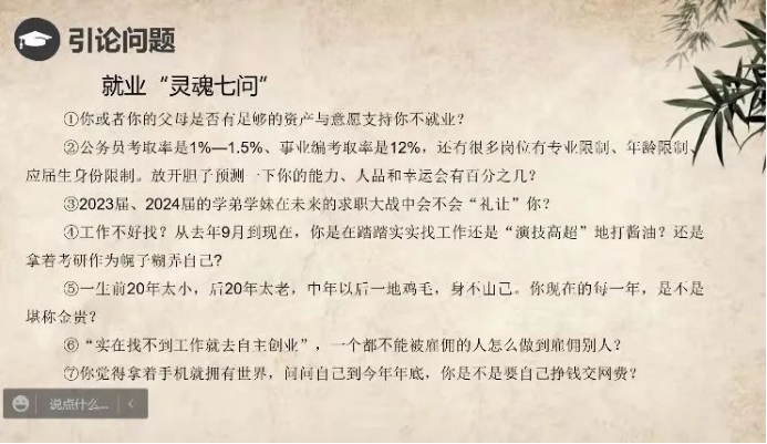 其次,招就部彭老师从就业形势、“慢就业”及其危害、如何主动就业和应届生身份的优势四个方面进行讲解。提醒同学们要抛弃不切实际的幻想,实事求是的解决问题,学会承担责任,为自己的未来着想。绝不敢错过“校招”这一绝佳机会(校招进入好公司的机会更多,要求相对较低,基本属于正式招聘);
