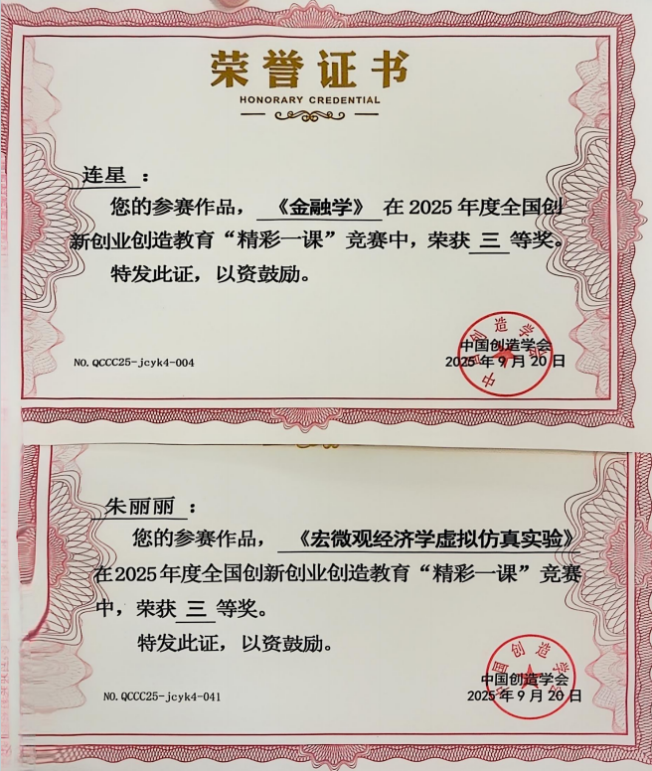 近日,2025年度全国创新创业创造教育“精彩一课”竞赛决赛在山东理工大学圆满落幕。本次大赛由中国创造学会主办,已列入全国普通高校教师教学竞赛清单,是全国创新创业创造教育领域的高水平权威赛事。经济系四位参赛教师凭借扎实的教学功底、创新的教学设计以及出色的现场表现,在决赛中脱颖而出,喜获佳绩。其中,侯婕老师(参赛课程《资产评估学》)、张蓉老师(参赛课程《期货与期权》)荣获全国决赛二等奖;朱丽丽老师(参赛课程《宏微观经济学虚拟仿真实验》)、连星老师(参赛课程《金融学》)荣获全国决赛三等奖。