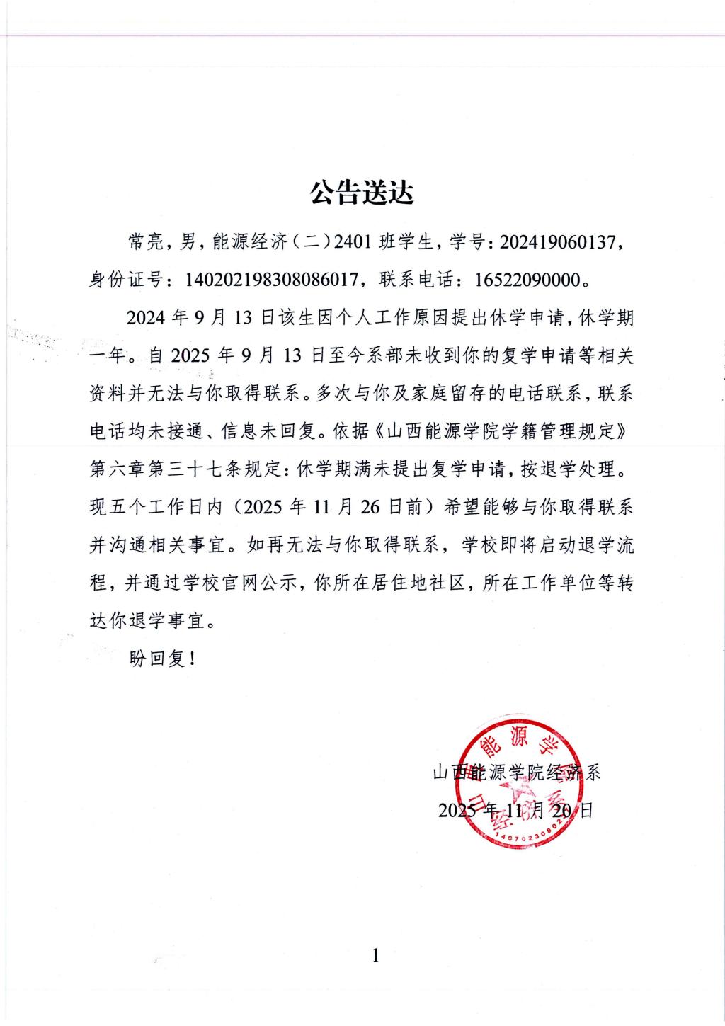关于向休学期满的学生常亮、罗晓锋催办复学事宜进行公告送达的通知