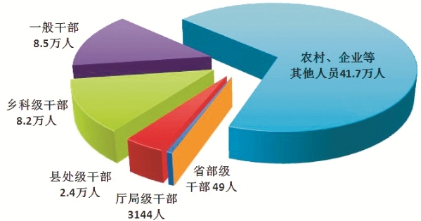 2023年,全国纪检监察机关共接收信访举报345.2万件次,其中检举控告类信访举报105.7万件次。处置问题线索173.3万件,其中谈话函询36.3万件。立案62.6万件,其中立案中管干部87人、厅局级干部3456人、县处级干部2.7万人、乡科级干部8.9万人;立案现任或原任村党支部书记、村委会主任6.1万人。处分61万人,其中党纪处分49.8万人、政务处分16.2万人;处分省部级干部49人,厅局级干部3144人,县处级干部2.4万人,乡科级干部8.2万人,一般干部8.5万人,农村、企业等其他人员41.7万人。