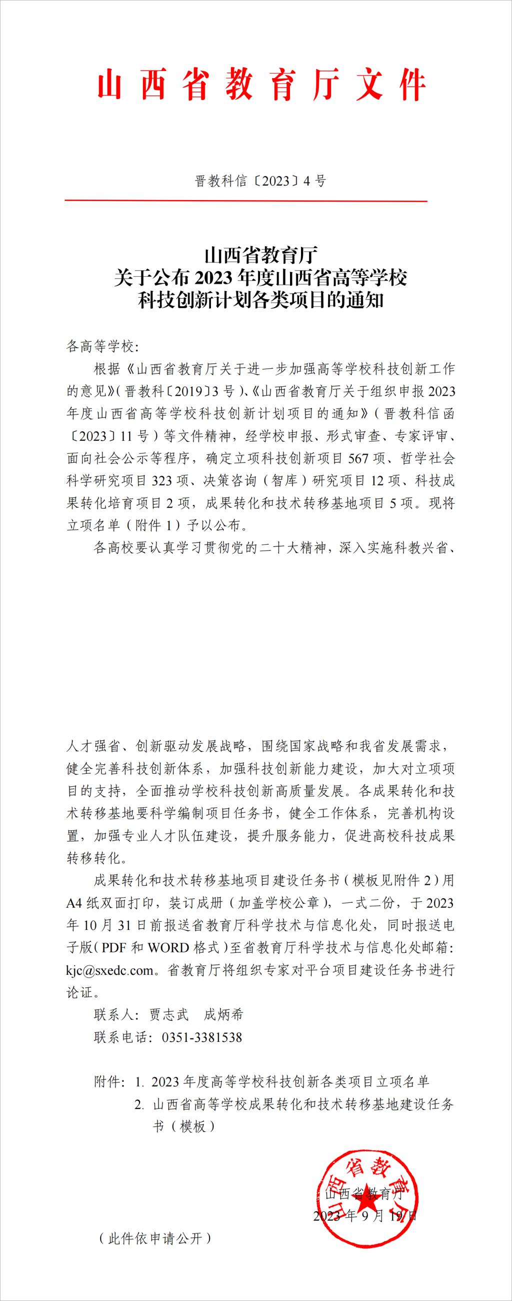 近日,山西省教育厅下发了《山西省教育厅关于公布2023年度山西省高等学校科技创新计划各类项目的通知》(晋教科信〔2023〕4 号),永利官网共计获批立项17项,其中2023年山西省高等学校科技创新项目获批16项,2023年山西省高等学校哲学社会科学研究项目获批1项。