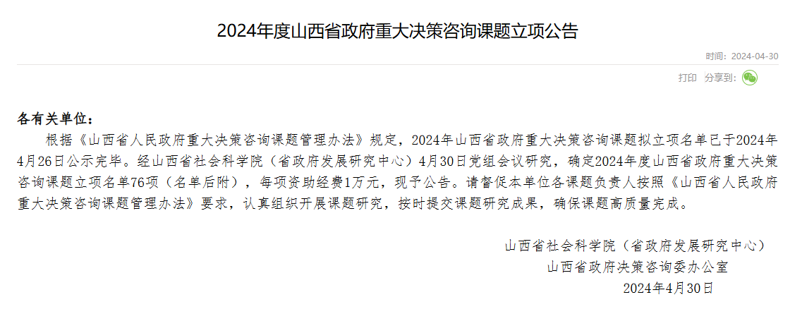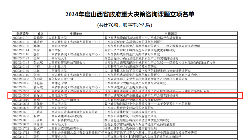 近日,山西省社会科学院(省政府发展研究中心)山西省政府决策咨询委办公室发布了2024年度山西省政府重大决策咨询课题立项公告,全省共76个项目立项。永利官网崔泽园副教授主持的《基于山西煤炭全产业链发展的新质生产力培育路径研究》获批立项。