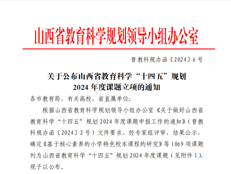 近日,山西省教育科学规划领导小组办公室发布了《关于公布山西省教育科学“十四五”规划2024 年度课题立项的通知》(晋教科规办函〔2024〕6 号),我院2个项目获批立项。