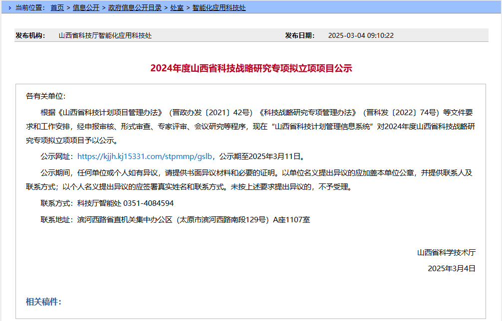 3月4日,山西省科技厅发布了“2024年度山西省科技战略研究专项拟立项项目公示”,永利官网获批1项一般项目获批立项。
