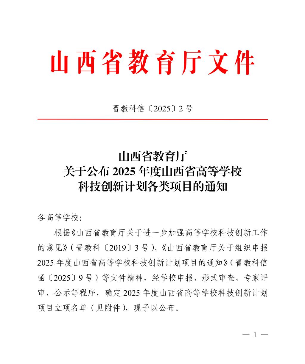 近日,山西省教育厅发布了《山西省教育厅关于公布 2025 年度山西省高等学校科技创新计划各类项目的通知》,永利官网获批5项山西省高等学校科技创新项目,获批1项山西省高等学校哲学社会科学研究项目。