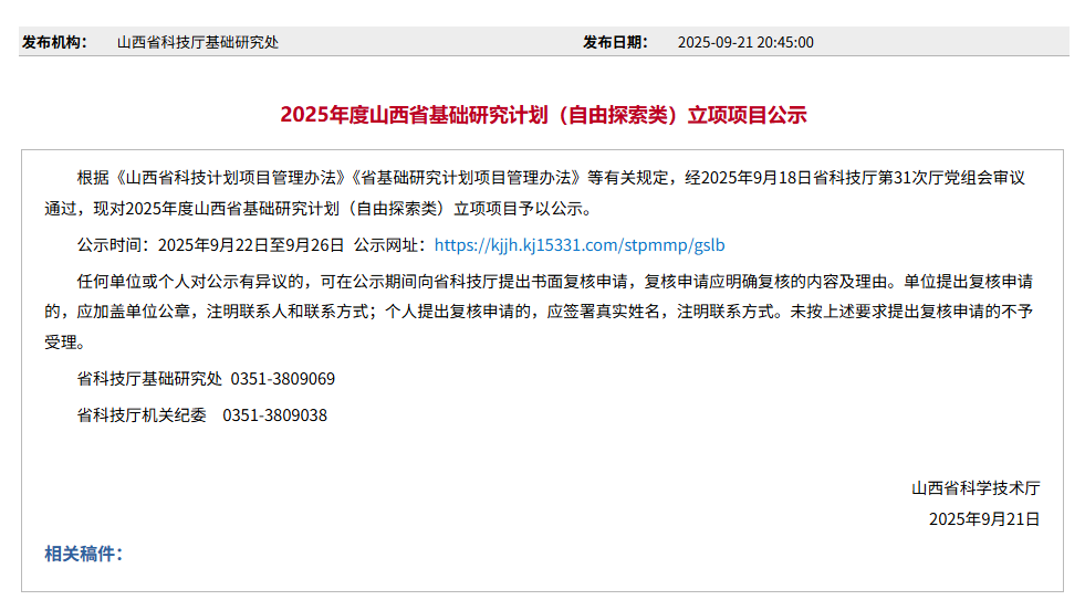 2025年度山西省基础研究计划(自由探索类)立项项目公示