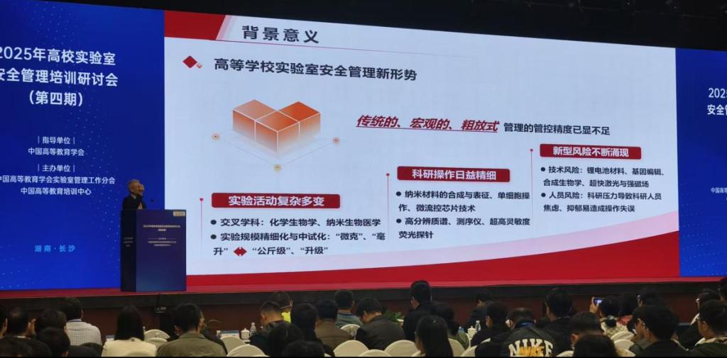 10月24日至27日,由教育部高等学校实验室建设与实验教学指导委员会主办的“2025年高校实验室安全管理培训研讨会(第四期)”在湖南长沙召开。本次会议汇聚了来自全国高校的近千名实验室管理工作者,围绕实验室安全管理的政策规范、风险防控与能力建设等议题展开深入交流。永利官网由实验实训中心综合管理办公室主任郝雷、能源化学与材料工程系副主任李永峰带队,教师李飞宇、武江红等人员参会。