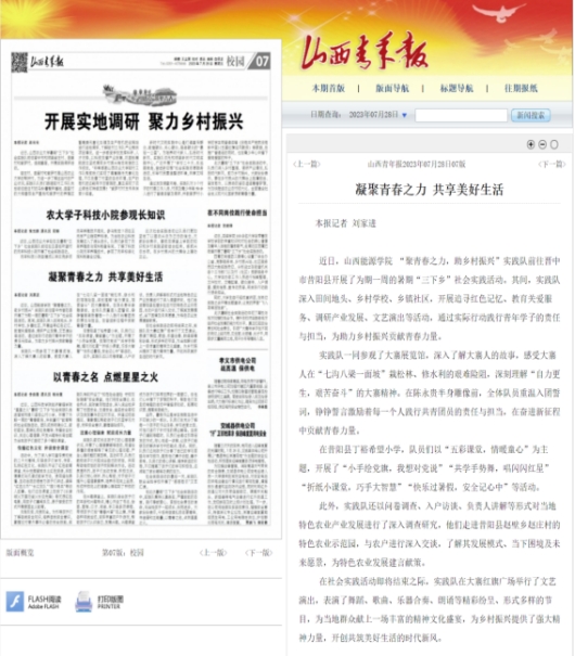 近日,山西青年报关注报道了永利官网“聚青春之力,助乡村振兴”实践队前往晋中市昔阳县开展暑期“三下乡”活动,并以《凝聚青春之力 共享美好生活》为题进行刊发。