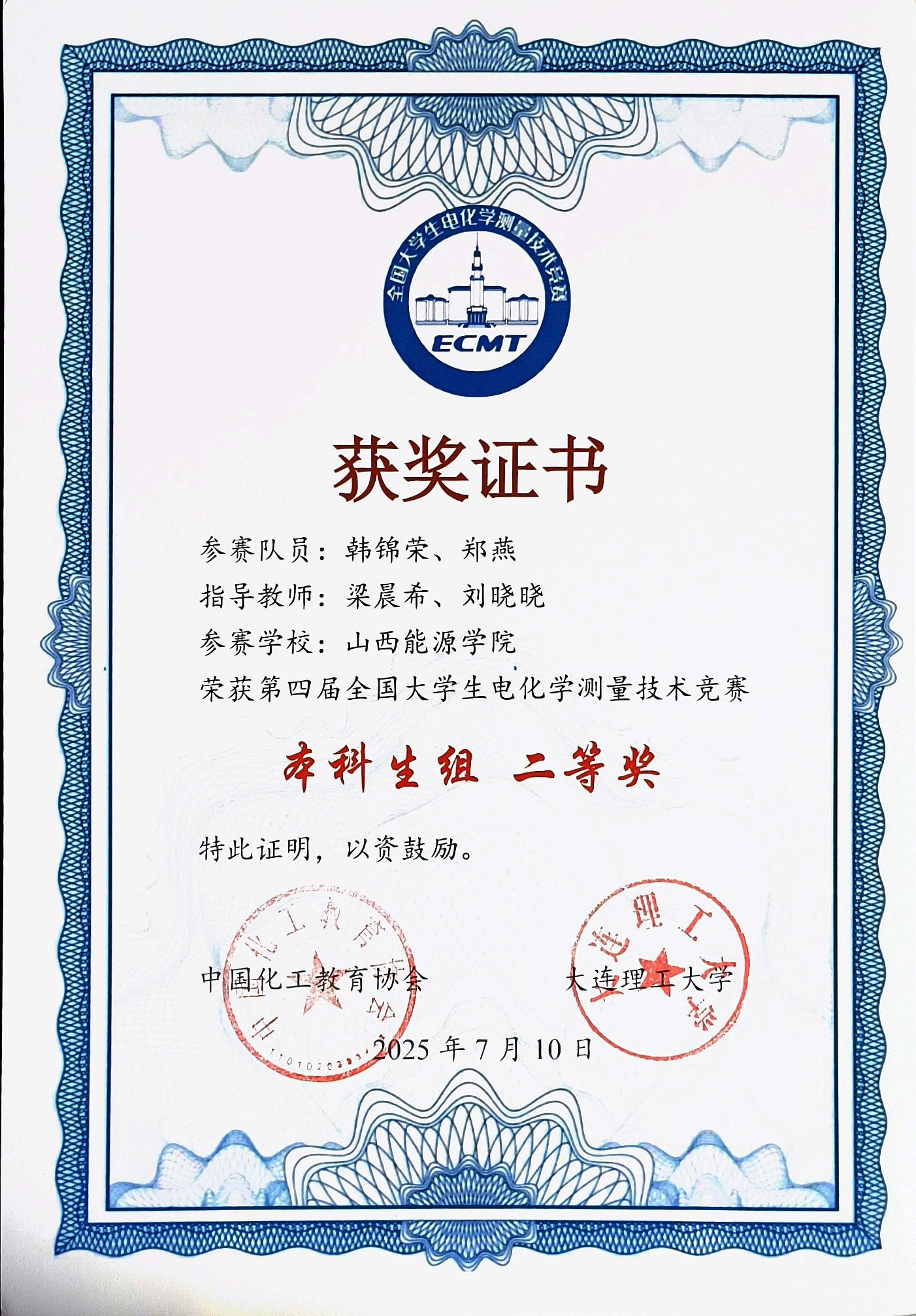 2025年7月14日,第四届全国大学生电化学测量技术竞赛获奖名单正式公布。yL23411永利官网登录能源化学与材料工程系能源化学工程专业22级学生韩锦荣、郑燕在梁晨希、刘晓晓两位教师的指导下,荣获本科生组二等奖。这是该专业首次在该项全国性竞赛中获奖,实现历史性突破。